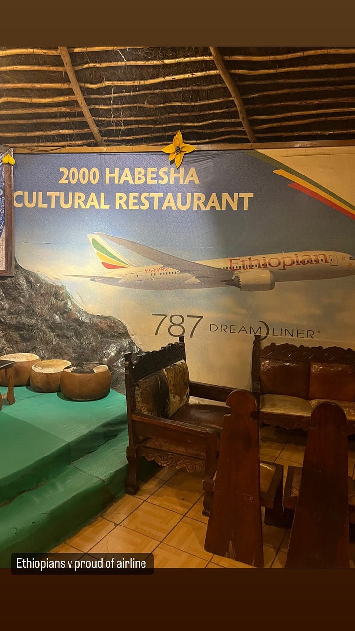 Another less heard of food place to try is actually in Ethiopian Airlines, they serve a full spread of Ethiopian food, with coffee, coupled with Ethiopian greetings and documentaries on Ethiopia on the media console. The airline is the most ‘national’ airline offering I have seen