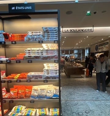 Tracing Franco-American ties. While browsing for truffled butter and snacking at the iconic La Grande Épicerie de Paris—the world’s oldest department store, owned by LVMH—I stumbled upon a humorous contrast: one aisle brimming with French cheeses, fresh baguettes, and cured meats; the other labeled États-Unis, stocked with just Heinz ketchup and a single plastic-wrapped bun. A bit of caricature of culinary cultures?