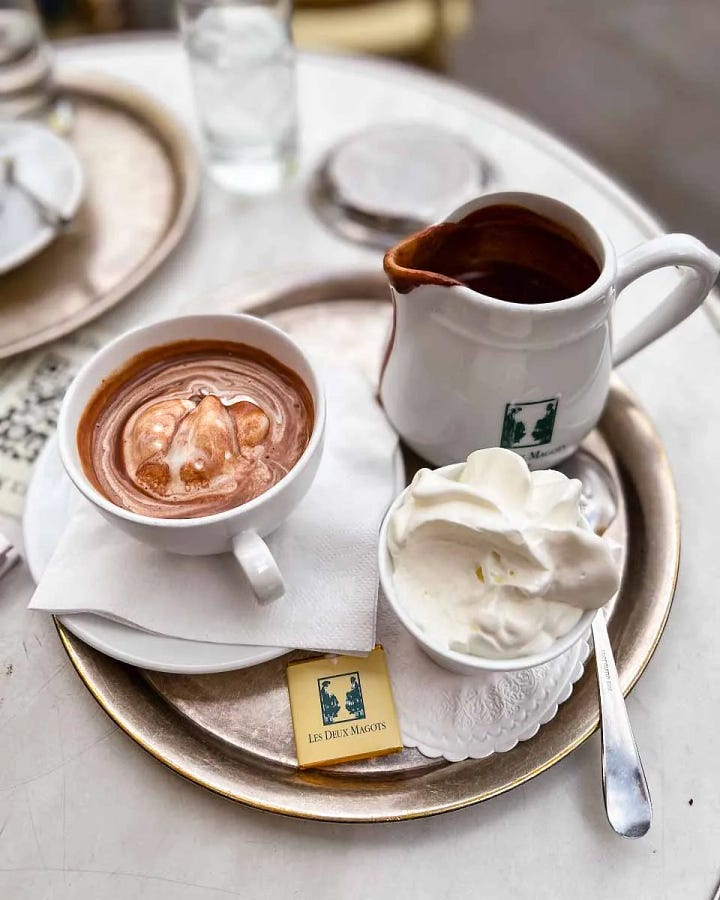 Winter was about coziness, tradition, and indulgence. I used to buy Galette des Rois—flaky, almond-filled pastries with a hidden fève (figurine), in celebration of Epiphany and the Three Kings. It’s also the season for sipping vin chaud and the most indulgent chocolat chaud affogato. My top three recommendations? Grom, Les Deux Magots, and Angelina Paris—in that order—for the best hot chocolates in town