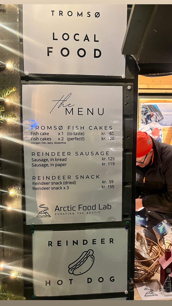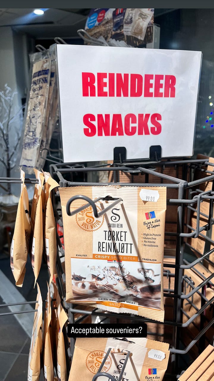 Trying bites of the Arctic land & sea. When in Tromsø, trying local delicacies is a must—even if they aren’t your usual go-to foods. Reindeer snacks weren’t exactly high on my list, but as the saying goes, "When in Rome (or Tromsø), do as the locals do." So, I gave both reindeer hotdog and reindeer chew snacks a try