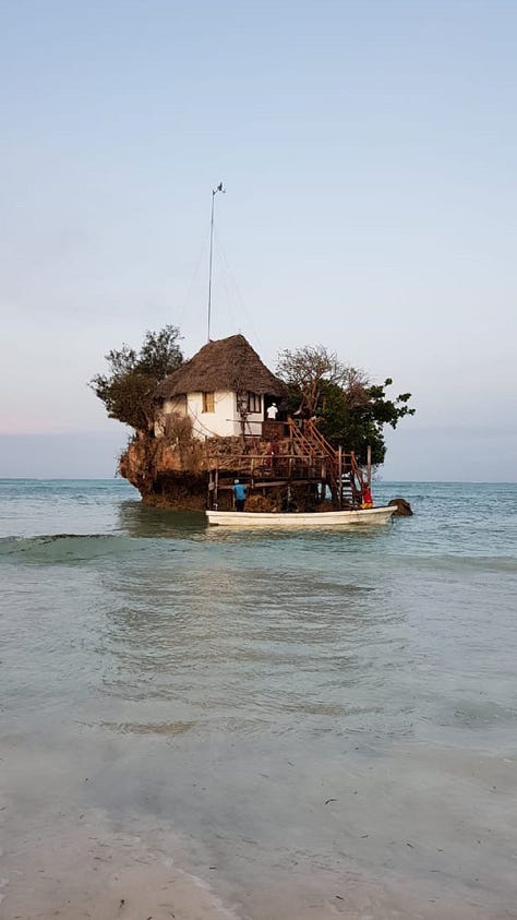 Walking in the sea for food. While there are plenty of dining options in Zanzibar, one that truly stands out—literally—is The Rock. This unique restaurant is accessible only during low tide, when a narrow sandbar emerges, allowing visitors to walk to it. When the tide is high, however, the restaurant seems to float on the water and can only be reached by boat. I found this out the hard way: I arrived at 4 pm for dinner, expecting a leisurely walk, but by the time I finished, the sandbar was submerged, and I had to take a boat back. Timing your walk is key—you definitely don’t want to end up halfway there and need a boat for the rest of the journey